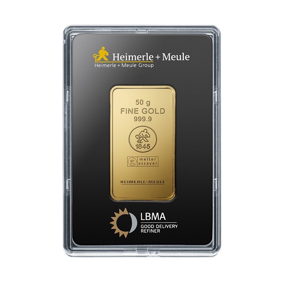 50 g Goldbarren von Heimerle + Meule, geprägt, 999,9 Feingold. Leicht lagerbar, flexibel handelbar und steuerfrei – perfekt für Anleger und Sammler.