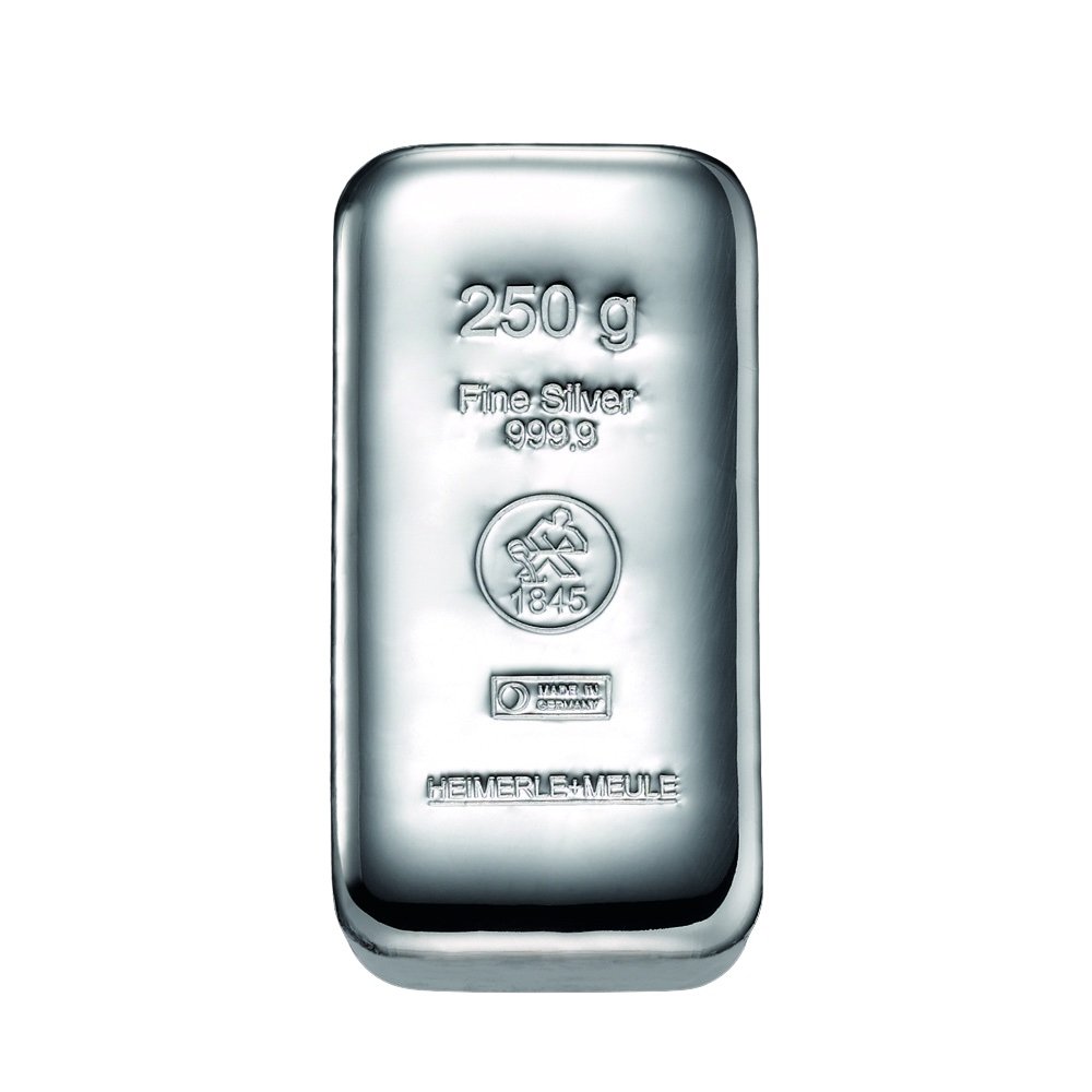 250 g Silberbarren von Heimerle + Meule, gegossen, 999,0 Feinsilber. Robust, flexibel handelbar und ideal für Anleger und Sammler.